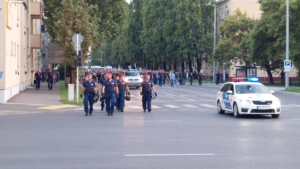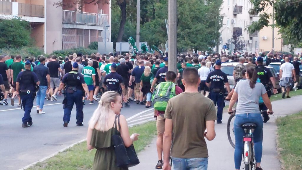 Amikor megérkeztünk, még felugrottunk az egyik ottani ismerősünkhöz, de még le sem főtt a jó erős feketénk, amikor rendőrszirénákra lettünk figyelmesek. Egyből kinéztünk az ablakon és azt láttuk, hogy rendőrségi konvoj közelített, majd a következő pillanatban már az egyre erősebben hallható dobolásra, szurkolói morajlásra és zöld színre lettünk figyelmesek.