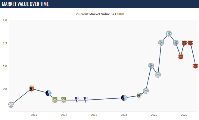 A 30 éves támadó piaci értéke így változott az elmúlt években a Transfermarkt adatbázisa szerint.