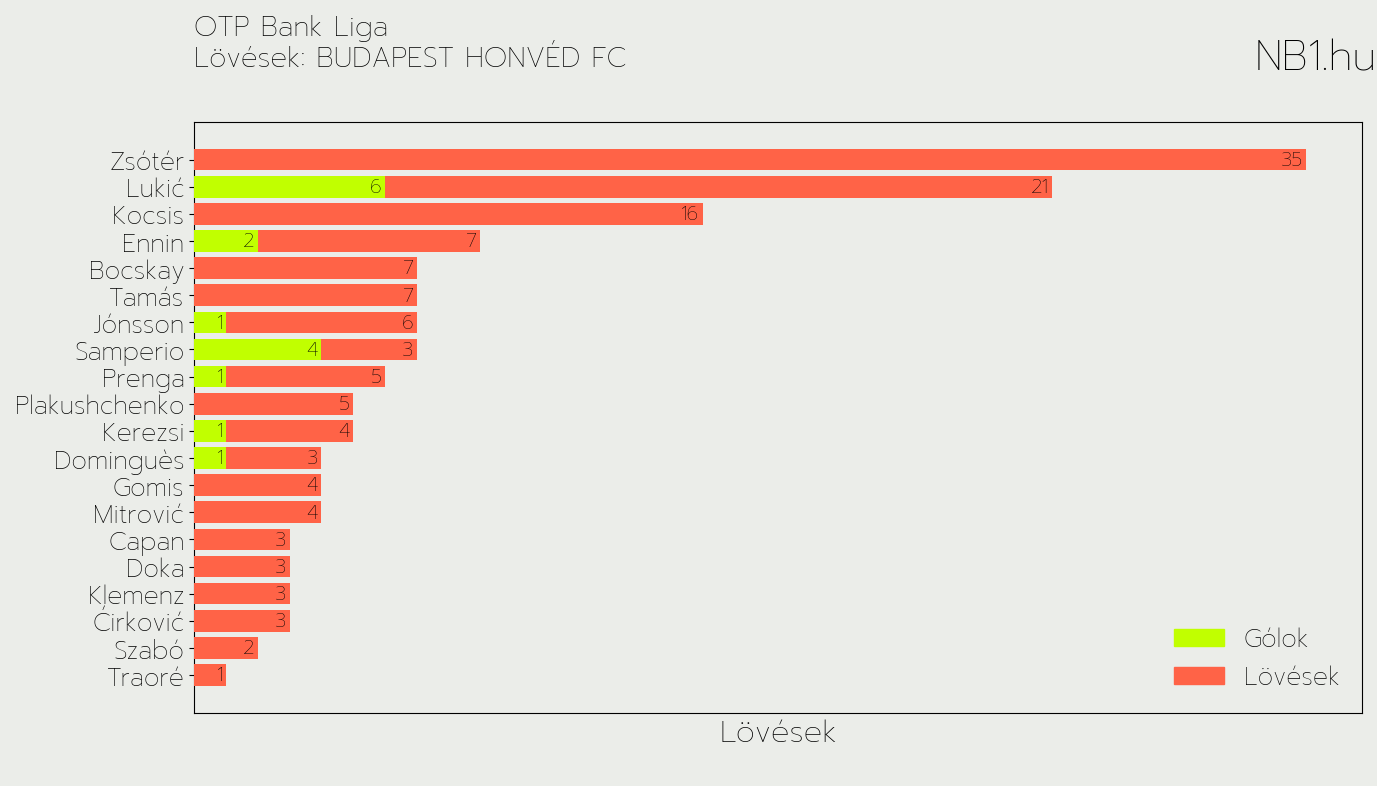 A kimutatásból kivehető, hogy Lukics lövőpontossága a második a Honvédból, a leghatékonyabb Jairo Sampeiro, mert az igaz, hogy összesen csak 7 próbálkozása volt, de abból 4 gól lett.