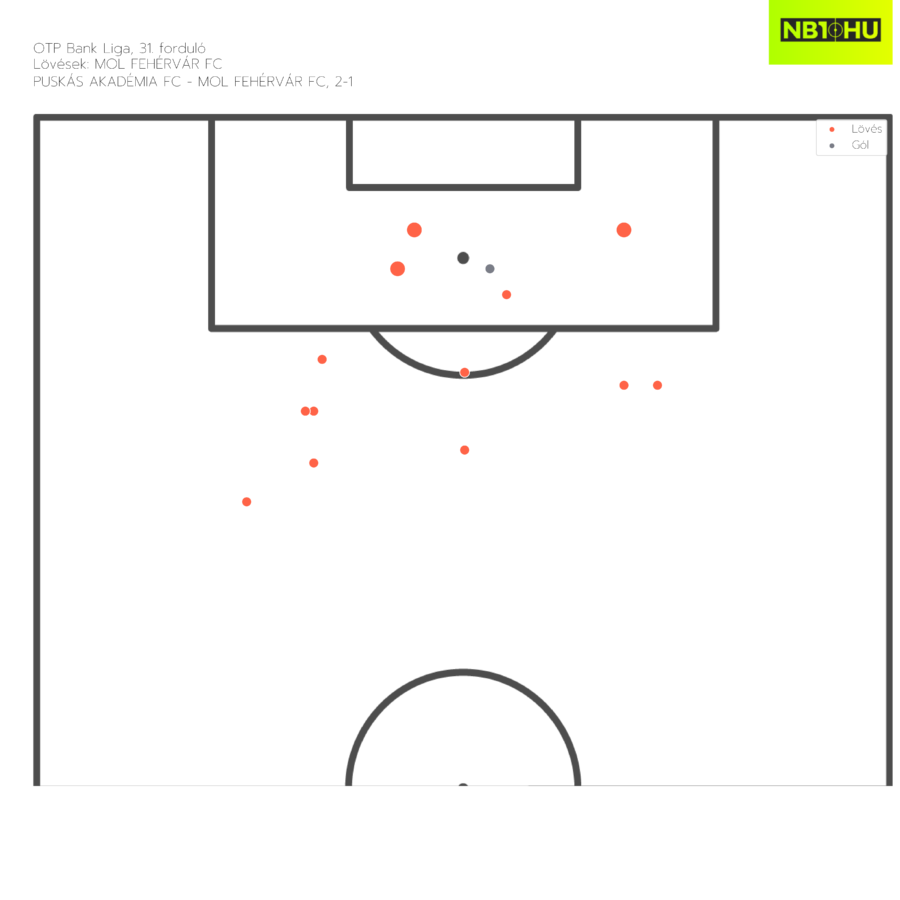 Ez a tendencia az ellenfél kapuja előtt valósággal kiteljesedik: tizenhatoson belüli labdaérintések számában már hátulról harmadik a Fehérvár, a teljes éves xG-t nézve pedig 37 gólra elegendő helyzetével utolsó előtti.