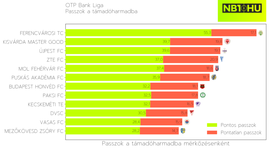 A közvetlen veszélyzónába, azaz a támadóharmadba viszont már ennél nehézkesebben jutnak el. Összes passzkísérlet terén itt már csak ötödikek, sikeres átadásokban negyedikek. Még mindig nem NB II-be kívánkozó mutató, ugyanakkor szemlélteti: ahogy a csapat közelebb ér a kapuhoz, úgy válik egyre valószínűbbé, hogy hibázik.