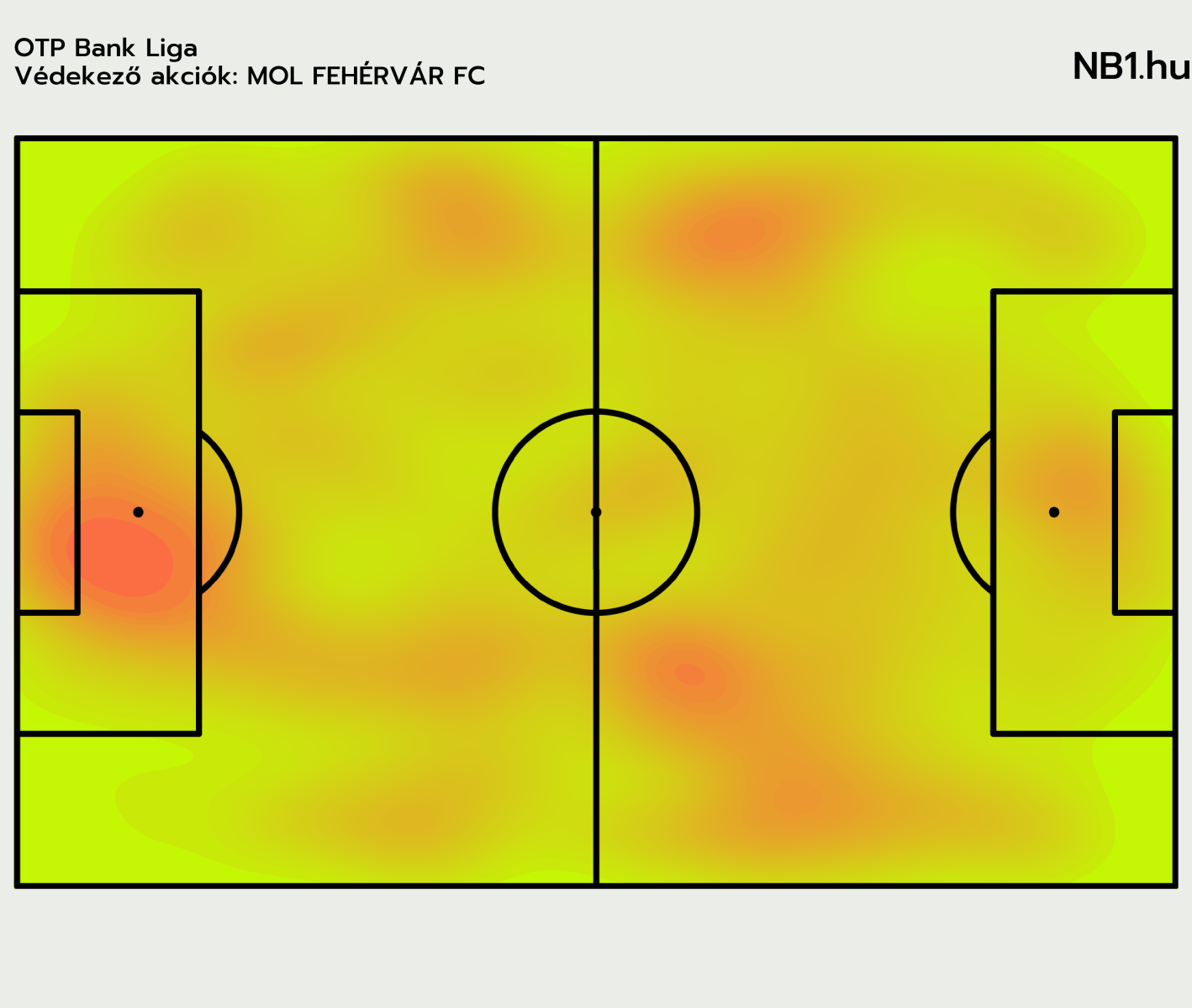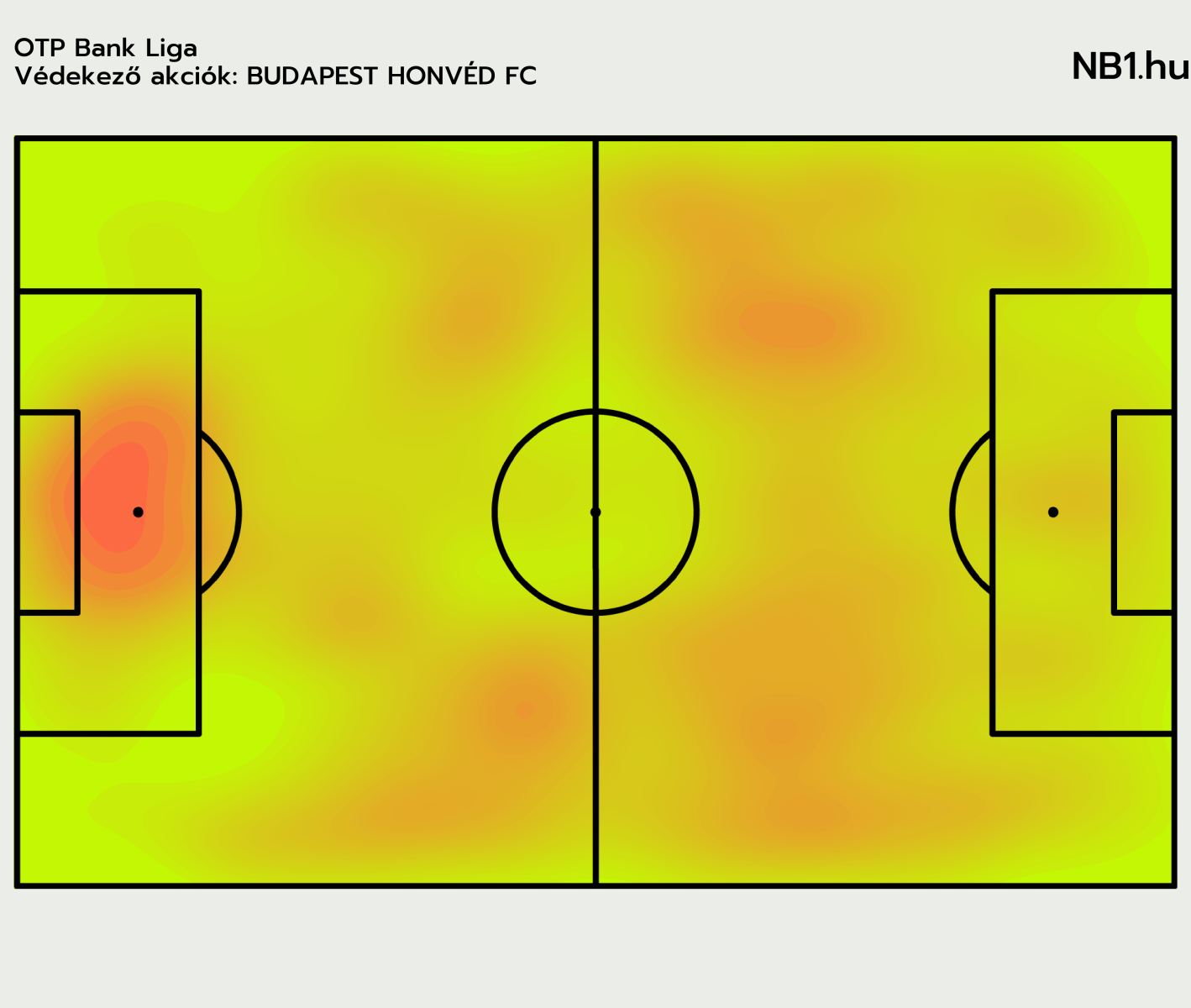 Ezzel nincsenek egyedül, hasonló hőtérképpel rendelkezik például az a Kecskemét is, amely viszont magasabb minőségű helyzetek ellen jóval hatékonyabban védekezik, ők meccsenként 1,74 várható kapott gólra átlagosan alig egyet kapnak.