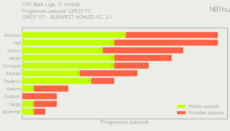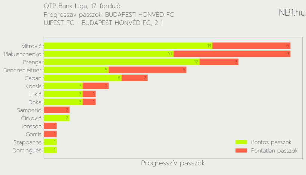 Az átadások közül kiemelkedően fontos a progresszív passzok kategóriája. Ezek olyan előre irányuló átadások, amelyek saját térfélről indítva legalább 30 vagy az ellenfél térfelén legalább 10 méteresek. Ebben egyik kiszemeltünk sem teljesített jól, de nem is ez volt az elsődleges feladatuk. Viszont váratlanokat tudtak volna húzni ezzel.