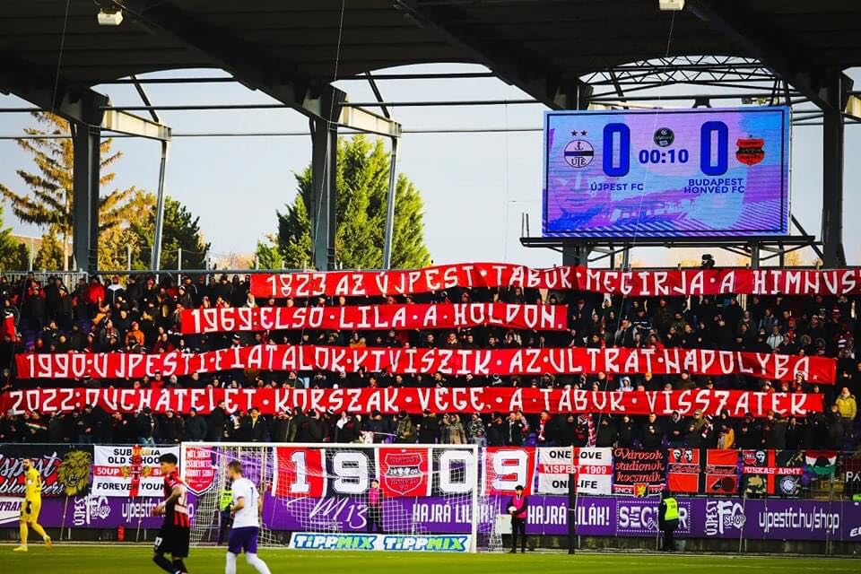 A vendégek is említésre méltó létszámban kirándultak el Újpestre. És ha már ott voltak, akkor frappáns kiírással válaszoltak a liláknak azért, mert az Ultras Kispest 30. születésnapján emlékezetes fricskát kaptak az egyik legnagyobb riválisuktól.
