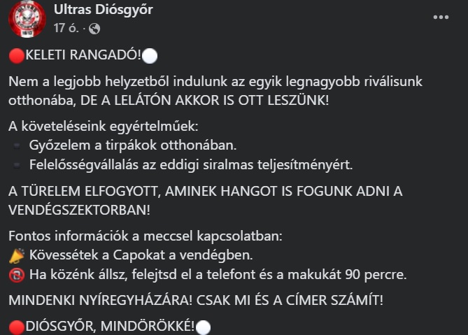 A hétvégén a DVTK az egyik nagy riválisa, a Nyíregyháza otthonában vizitál. A Szpari stadionjában is jelen lesznek a diósgyőri ultrák, de ahogy a Facebookon kiadott közleményből kiderül, a türelmük elfogyott, és ennek hangot is adnak majd a szombati bajnokin. A kommüniké szerint a leghűségesebb drukkereknek az egyik követelésük az, hogy az eddigi siralmas teljesítményért legyen felelősségvállalás. Azt is kérik az ultrák, hogy a rangadón a szurkolók ne a telefont nyomogassák.