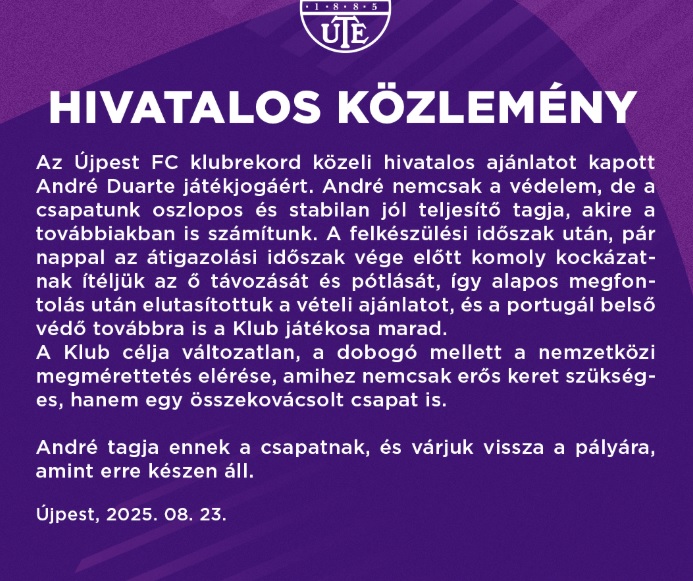 Az újpestiek a hivatalos oldalukon jelezték, hogy a lila-fehér csapat klubrekord közeli hivatalos ajánlatot kapott André Duarte játékjogáért.