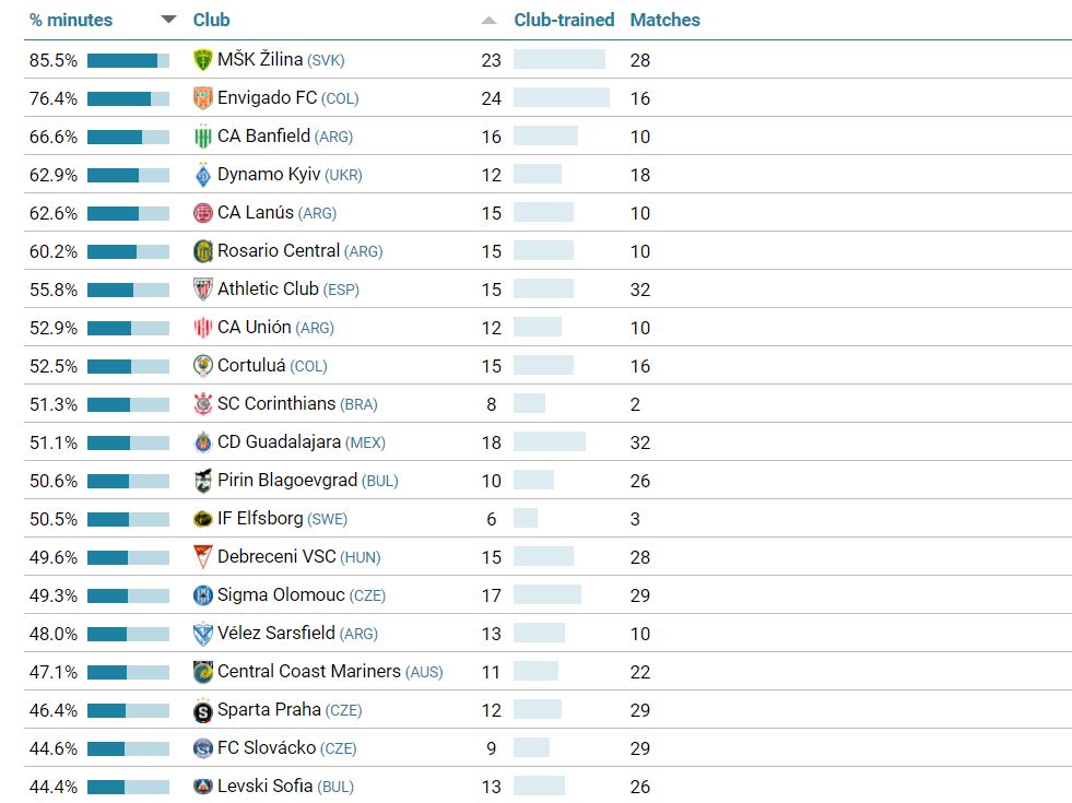 Az összes európai és kilenc Európán kívüli bajnokságra vonatkozóan azt tanulmányozták, hogy a mostani idényben – április 19-ig – az egyes csapatoknál hány saját nevelésű játékos lépett pályára, és ők a játékpercek hány százalékát tették ki. A CIES megjegyzi, azokat a labdarúgókat vették figyelembe, akik 15 és 21 éves koruk között legalább három évet az adott csapatnál töltöttek.