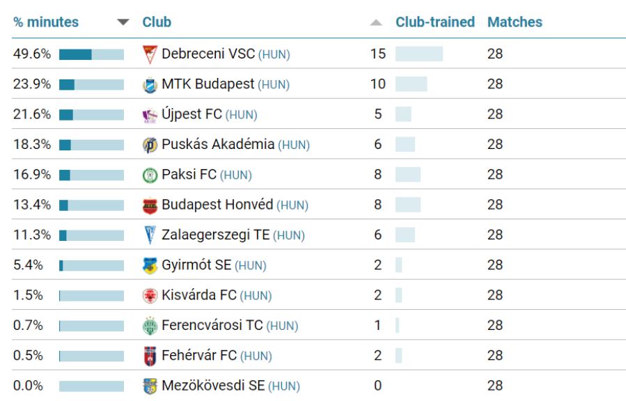 Magyarországon a csaknem 50 százalékos Loki mögött a második helyezett MTK Budapest 23.9-cel, a harmadik Újpest 21.6 százalékon áll. A kimutatás szerint Mezőkövesden egyetlen perc sem jutott a kritériumoknak megfelelő futballistának, de szintén egy százalék alatti mutató jött ki a Mol Fehérvár FC és a Ferencváros esetében is.