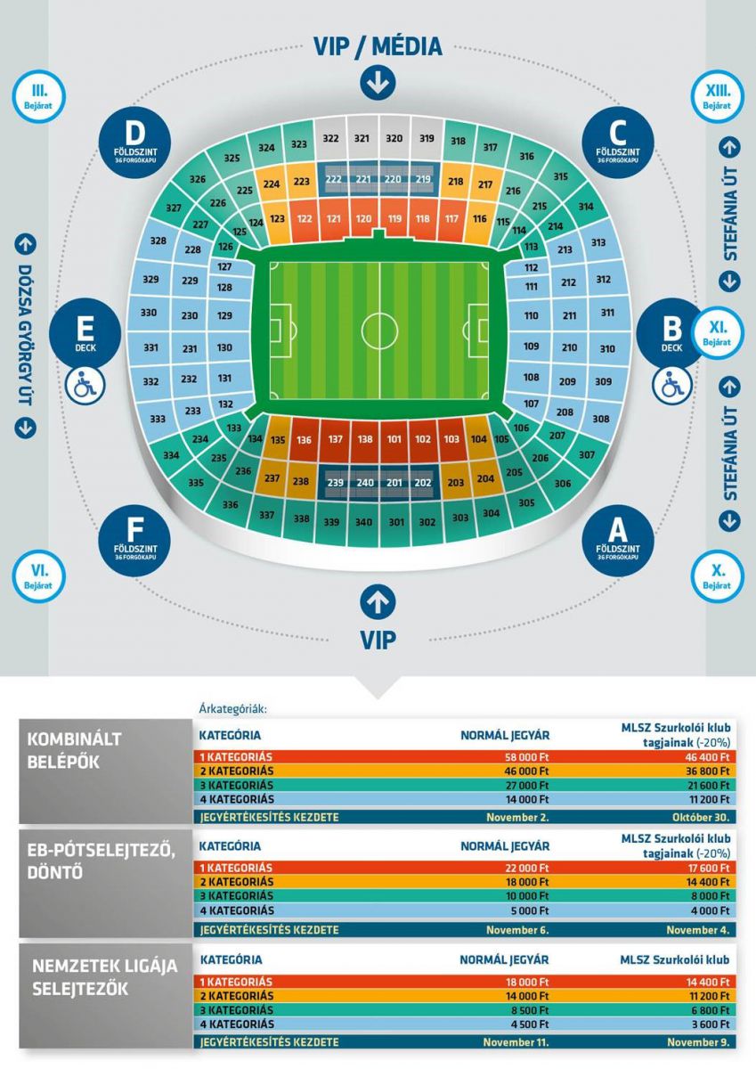 Első körben, október 30-án, 10.00 órától a Szurkolói Klub tagjainak lesz lehetőségük kombinált jegyet vásárolni a három összecsapásra, a klubtagok 20%-os kedvezményt is kapnak a belépők árából. Amennyiben három nap alatt nem fogynak el a belépők, november 2-án, 10.00 órakor megnyílik a lehetőség a vásárlásra azok számára is, akik nem tagjai a Szurkolói Klubnak (A Szurkolói Klubba való belépésről minden információ elérhető a https://szurkoloiklub.mlsz.hu oldalon).