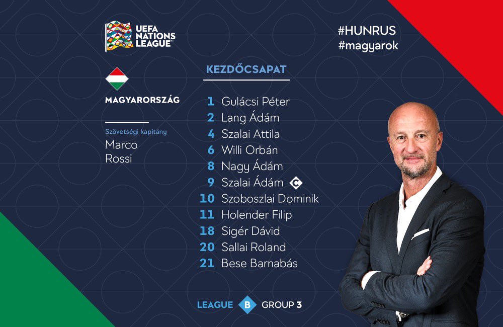 Mind a magyar, mind az orosz nemzeti együttes összeállítása hivatalos a Puskás Arénában 18 órakor kezdődő Nemzetek Ligája-találkozóra (tv: M4 Sport).