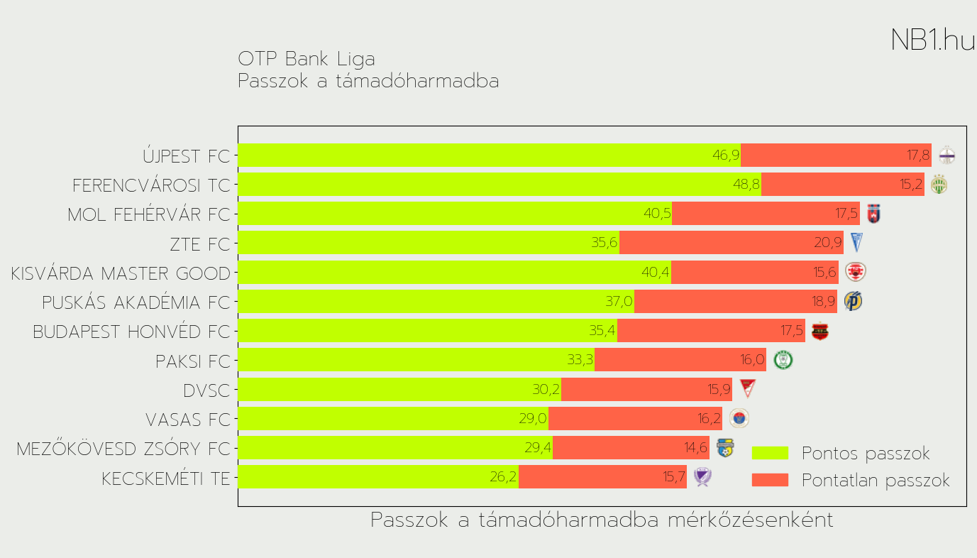 Egy együttes offenzív potenciáljáról az is sokat elmond, hogy hány labdát tud sikeresen eljuttatni az ellenfél védekező-, azaz a saját támadóharmadába. Nem feledve az előző ábra tartalmát, íme ehhez is egy vizuális kísérő, amelyet egy lapra téve az előzővel egy, a két szóban forgó csapaton kívül álló érdekességet is megfigyelhetünk.