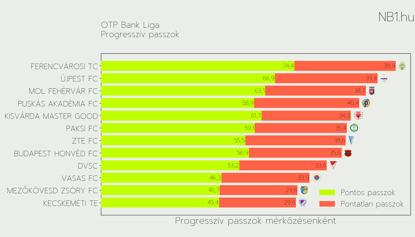 A két gárda gondjai viszont nem az ellenfél kapuja előtt kezdődnek. Bár nem minden statisztikában bérli ki a kiesőzónát a két pesti együttes, láthatóan azokban a mutatókban sem jeleskednek, amelyek a támadásbefejezést megelőző építkező munkát hivatottak elemezni. Íme például a progresszív, azaz a támadások előrehaladását érdemben szolgáló passzok összesítése.